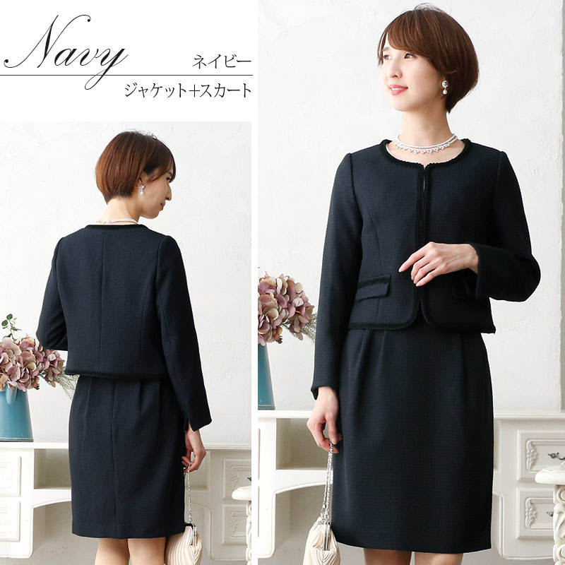 スーツはジャケットとワンピースのセットになっていて、オールシーズン対応できる点やシワになりにくい点が口コミで人気です。サイズ展開が豊富なのもうれしいですね。