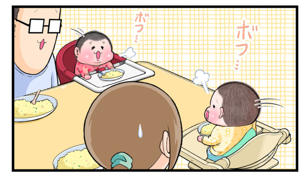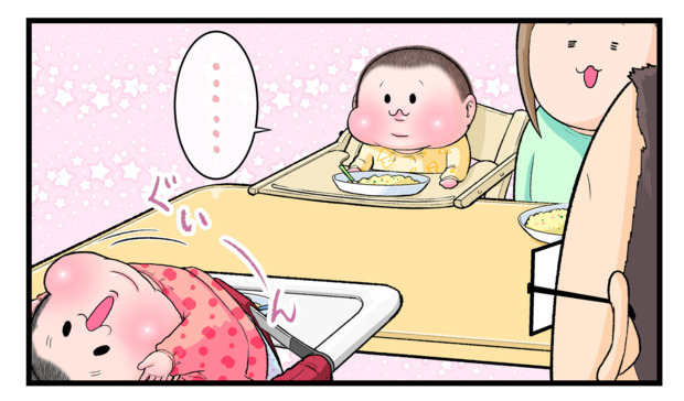 赤ちゃんはさまざまな気持ちを表情や身体を使って表現します。前回でにくきゅうぷにおさんの次男・ぷにすけくんが、食事中に椅子の上でグイーンと反り「おいしい」と表現していました。ヒヤッとするシーンではパパが頭を支えて危険を防いでいましたが、今度は長男・ぷにおくんがグイーンと反り返り…。