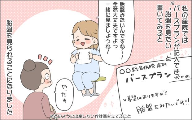 産院によって、また自身の希望などにより、妊娠中に記入することができるバースプラン。おかめさんはこまめちゃんを妊娠中のときに、そのバースプランにやってみたいことを記入していたようですね。