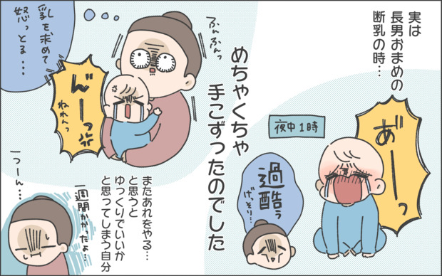 しかし、悩んだものの軽い気持ちで断乳に挑戦することに。すると、離乳食とミルクの間に挟んでいたおっぱいを抜き、食事の順番や量を調整するだけであれよあれよという間に断乳に成功しました。