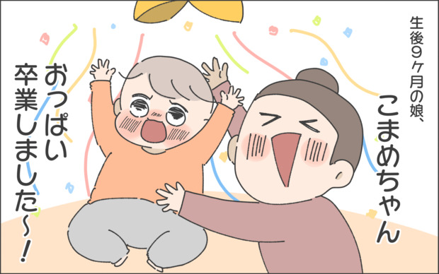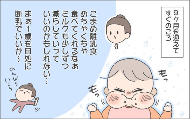 生後9ヶ月のこまめちゃんは離乳食も順調に進んでいたようですね。そこで、もうすぐ断乳かなと考え始めたおかめさんでしたが、お兄ちゃんのときは過酷だったことを思い出し、断乳はこまめちゃんが1歳くらいになったときで良いかなと考えていました。
