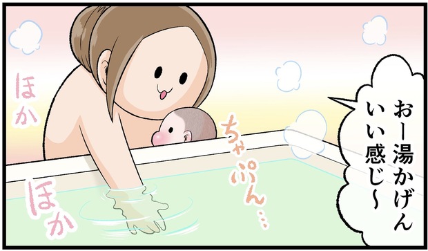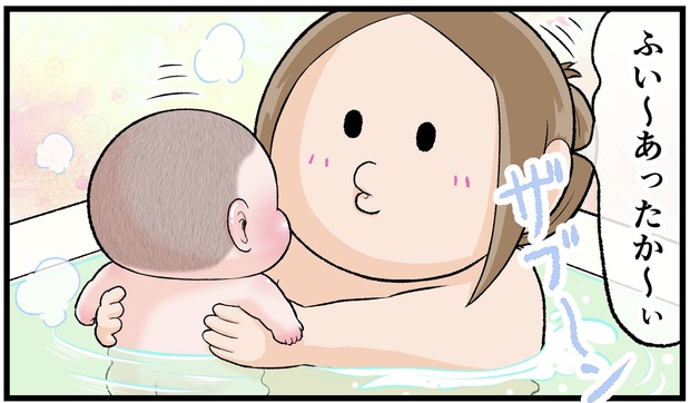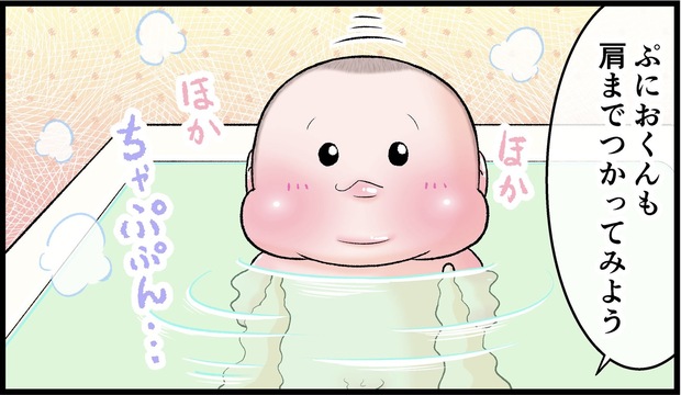 薄い髪の毛にプニプニのお腹、湯船にはいると「ゔぇ〜い」」と唸り声をあげる…これは確かにおっさんかもしれません(笑)。唸り声だけでなく、お風呂に大満足そうな長男・ぷにおくん(当時3ヶ月)の表情にも注目です!
