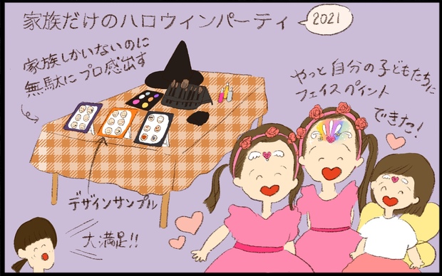 こちらはエッセイ内で紹介されたおおもりさん宅のハロウィンの写真を掲載しております。家族みんなでフェイスペイントを楽しんでいる様子が伝わってきます。家族で特別な時間を過ごしたようですよ。
