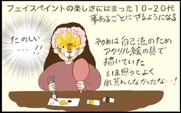 昔から絵を描くのが好きだったわたしが学生のころにはまったのが「フェイスペイント」です。フェイスペイントをすると自分ではない何かになれることが楽しくて、ハロウィンやパーティーで個人的に楽しんでいました。