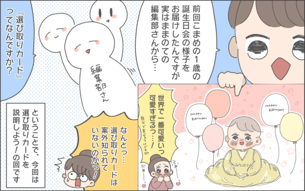 育児マンガ家おかめ(@omame_okame)さんの日常の出来事や奮闘をマンガでお届けします。前回は、娘・こまめちゃんの1歳お誕生日会についてお届けしました。地域によって1歳の記念行事は様々なようですが、こまめちゃんのお誕生日会で盛り上がった「選び取りカード」の魅力をおかめさんに教えていただきました!