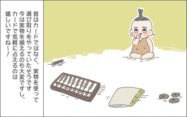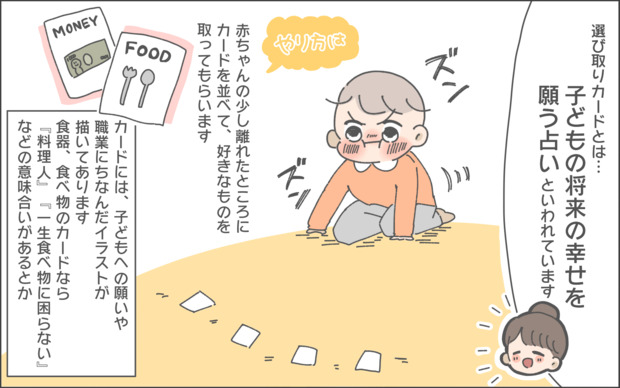 「選び取りカード」とは、意味を持たせた何かしらの絵が描かれたカードを赤ちゃんの少し離れたところに並べ、どれを取るかでその子の将来を占うというもの。赤ちゃんの将来の職業や才能を占うことができるものだそうです。何を取るかは実際にやってみないとわからないなんて…これは盛り上がりますね♪