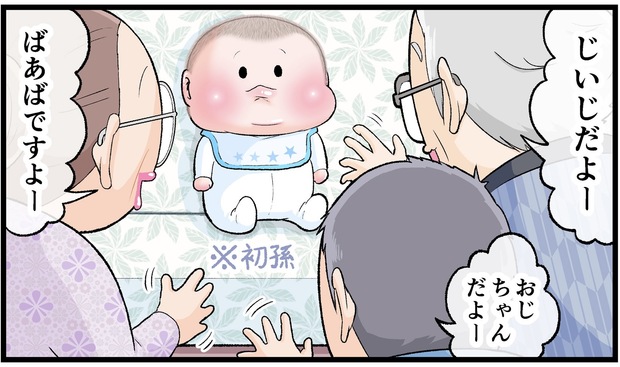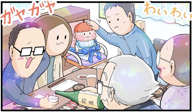 初めての場所で見慣れない大人に囲まれ、かたい表情をみせるぷにおくん(当時3ヶ月)でしたが、次第に生き生きとした表情へと変化していますね。初孫に会えて嬉しいじぃじやばぁばたちの気持ちが伝わったのでしょうか。大人たちがわいわいガヤガヤしている雰囲をみていつもより目を輝かせていたそうですよ。