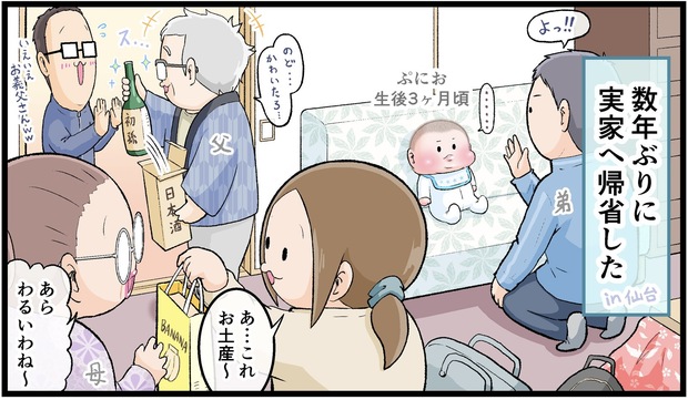 大人気にくきゅうぷにおさん(@nikukyupunio)の漫画をご紹介します。長期連休などを利用して赤ちゃんを連れて帰省する方は多いでしょう。見慣れない人や場所に赤ちゃんのご機嫌が悪くならないか心配ですよね。にくきゅうぷにおさんはぷにおくんが生後3ヶ月のとき、数年ぶりに実家に帰省したそうです。ぷにおくんの反応とは…?